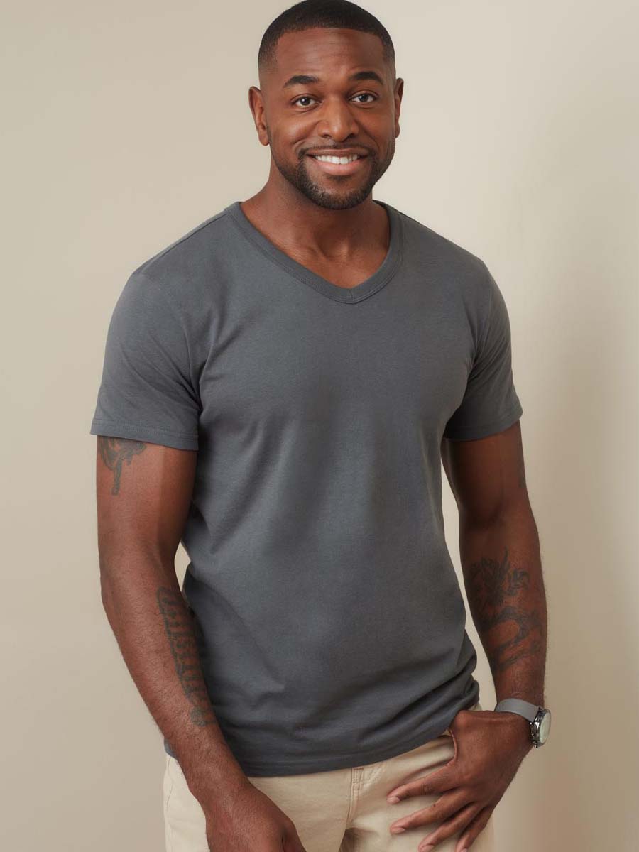 Classic cut V-neck T-shirt for men features collar with rib binding and made of durable single jersey cotton.